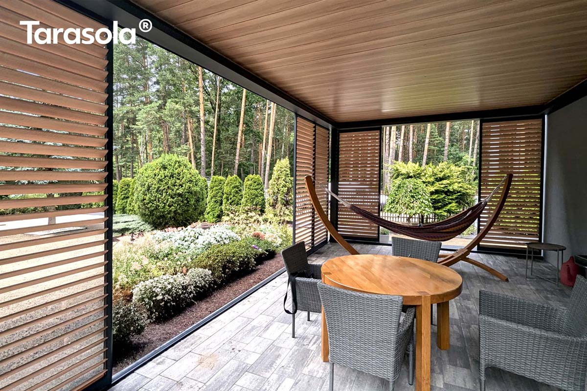 Na tarasach szczególnie narażonych na wiatr najlepiej sprawdzają się przeszklenia bezramowe z hartowanego szkła o grubości 10 mm oraz shuttersy, które tworzą stabilną i trwałą barierę boczną. Rolety ZIP również są odporne na podmuchy wiatru dzięki prowadzeniu tkaniny w systemie ZIP.