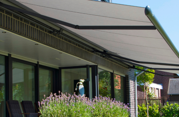 Ochrona przed słońcem i deszczem – zadaszenie szklane i zintegrowana markiza.
