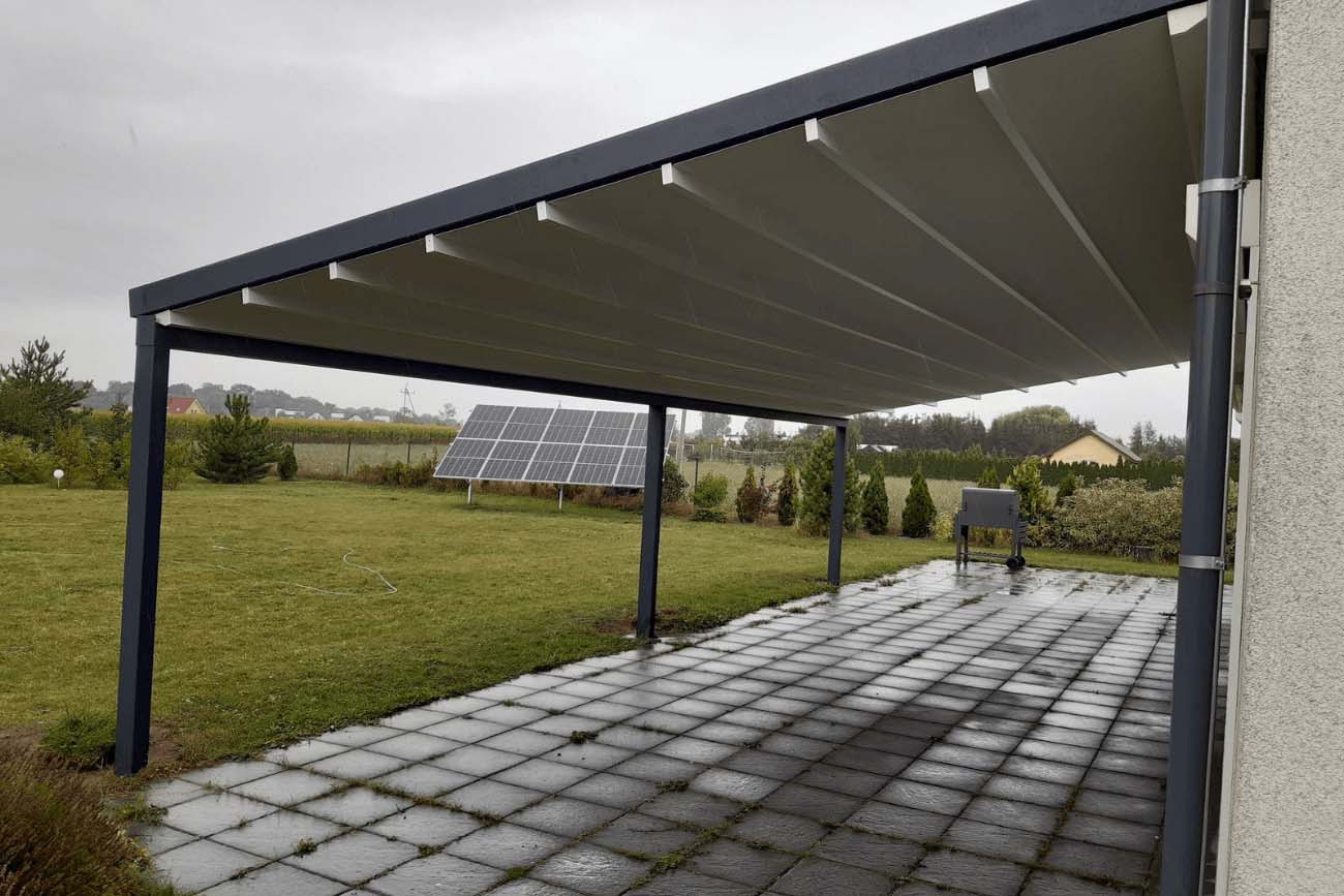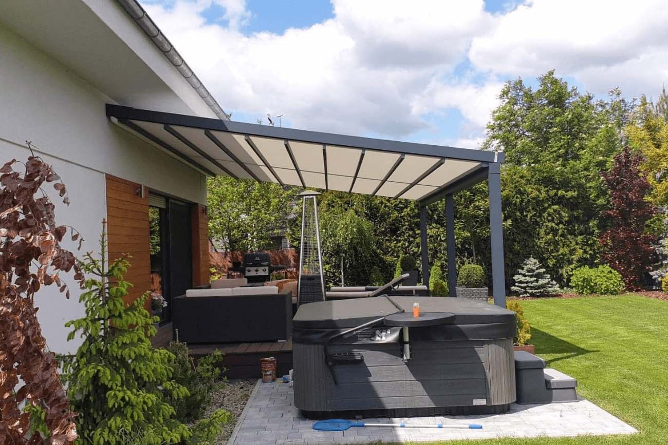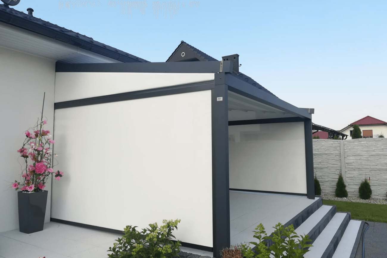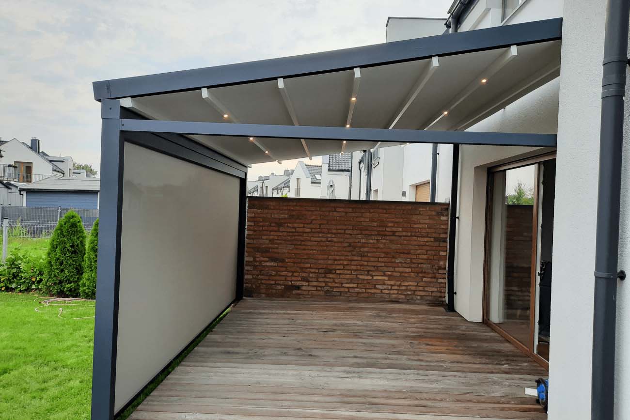 Klasyczna pergola aluminiowa z rozwijanym dachem materiałowym wykonanym z trójwarstwowej tkaniny Techprotect, która skutecznie chroni przed opadami deszczu oraz nadmiernym nasłonecznieniem. Konstrukcja składa się z jednospadowego dachu, daszka systemowego oraz ukrytej rynny w belce frontowej.