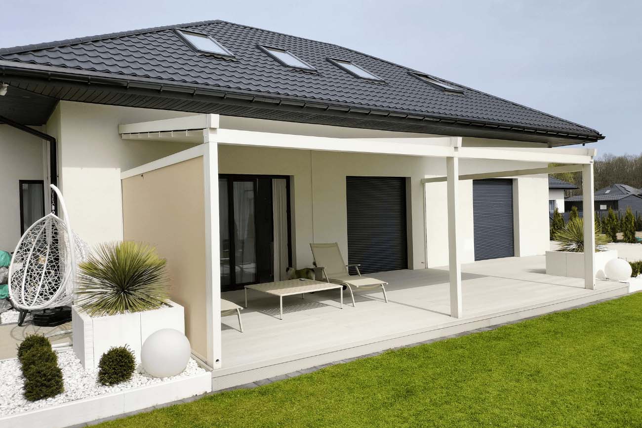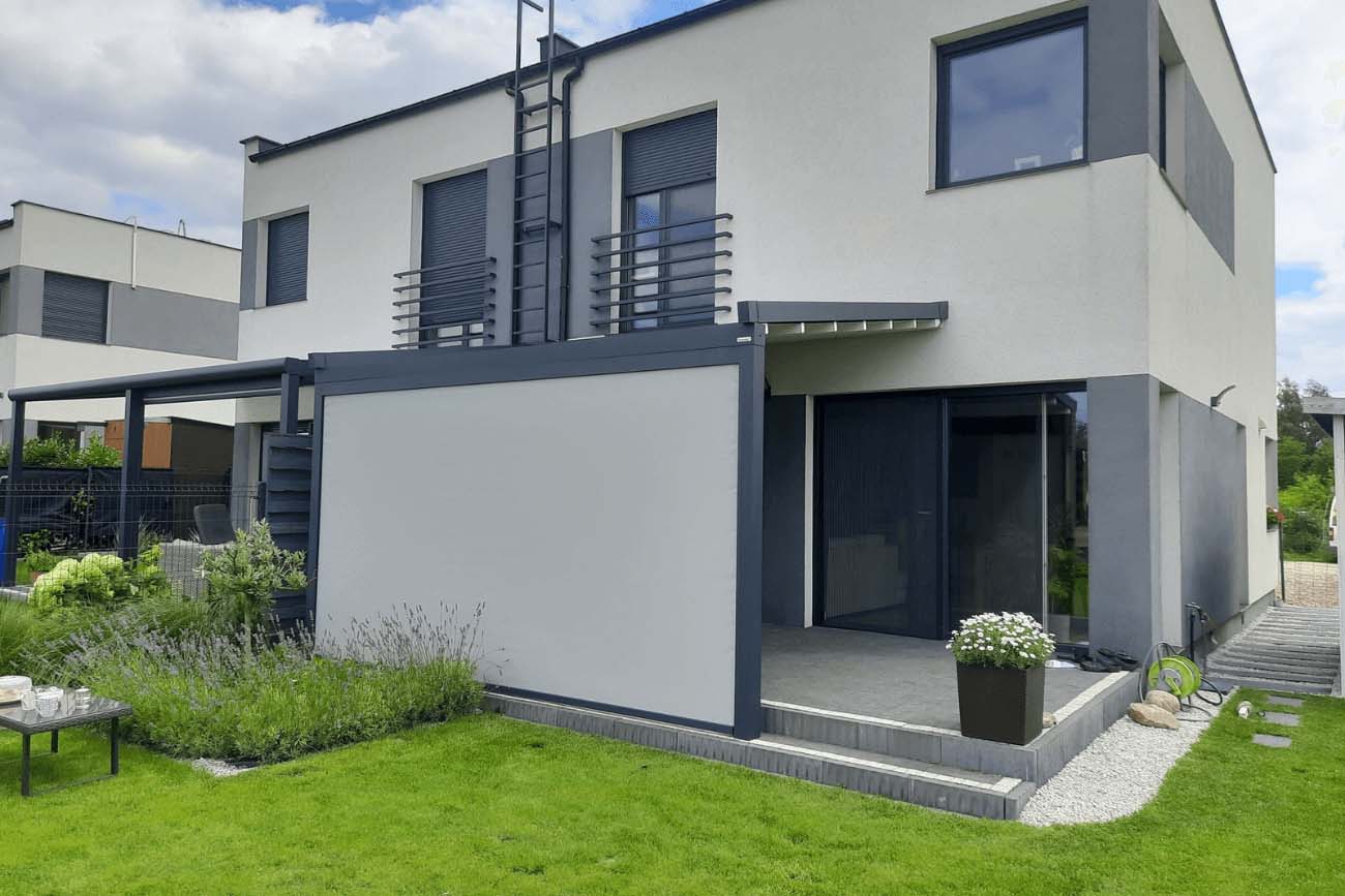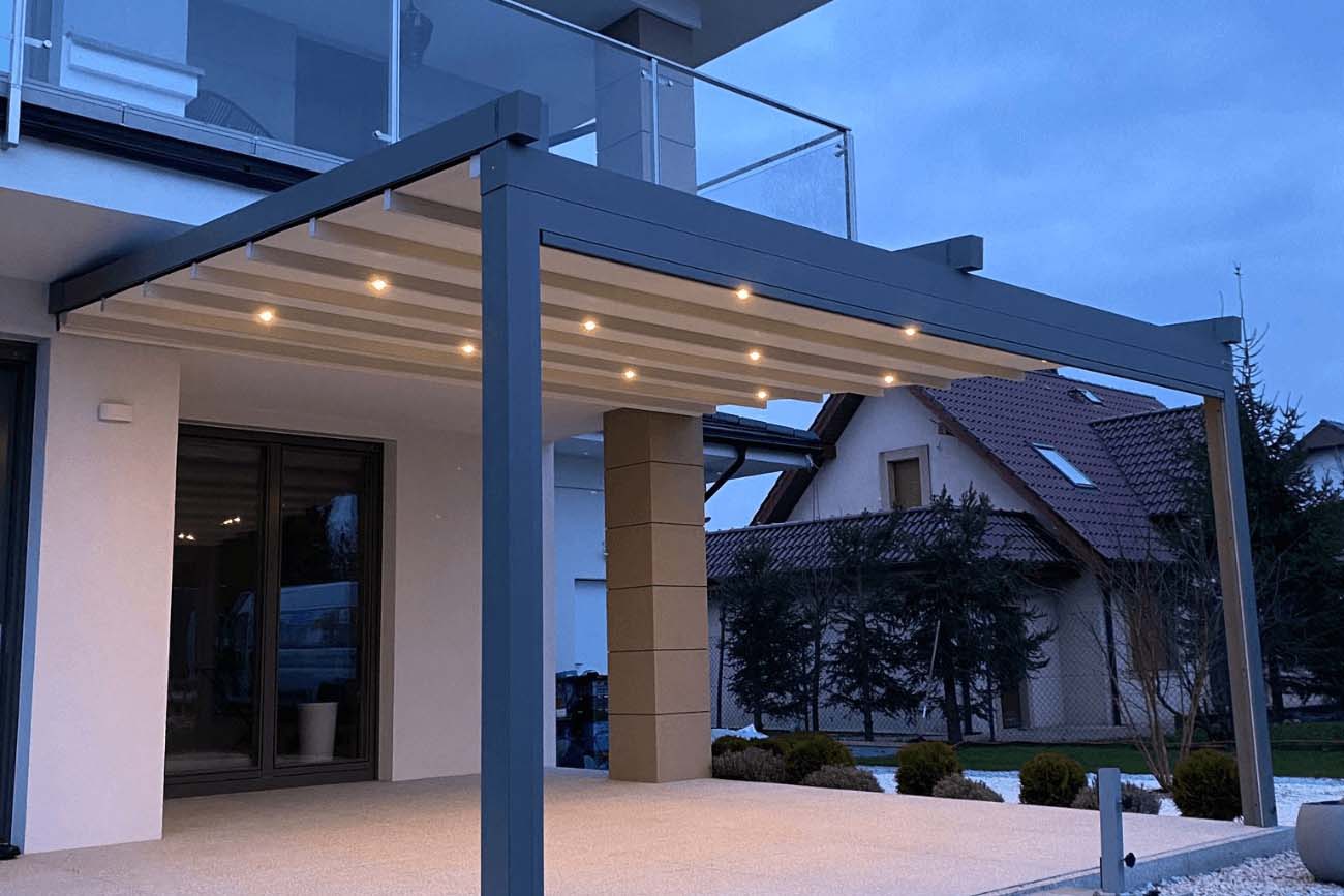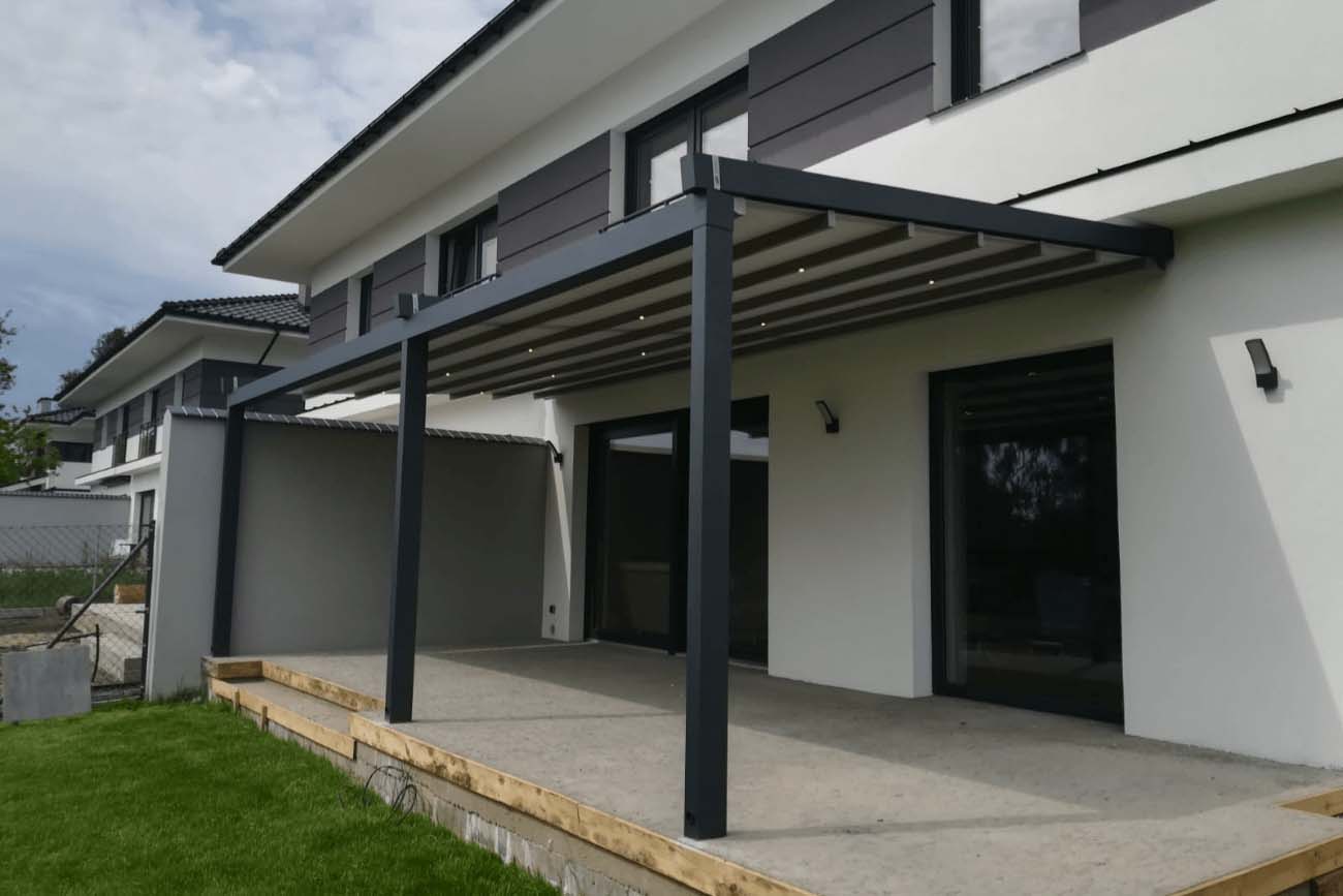 Klasyczna pergola aluminiowa z rozwijanym dachem materiałowym wykonanym z trójwarstwowej tkaniny Techprotect, która skutecznie chroni przed opadami deszczu oraz nadmiernym nasłonecznieniem. Konstrukcja składa się z jednospadowego dachu, daszka systemowego oraz ukrytej rynny w belce frontowej.