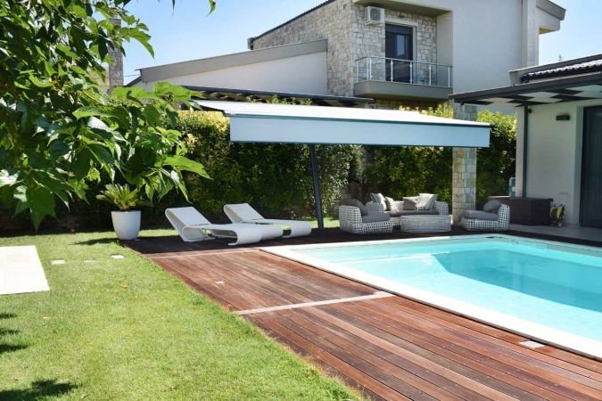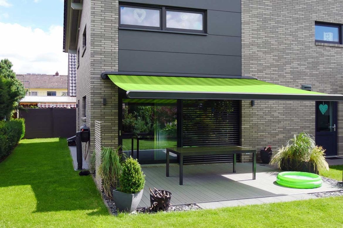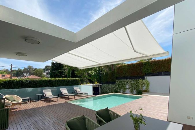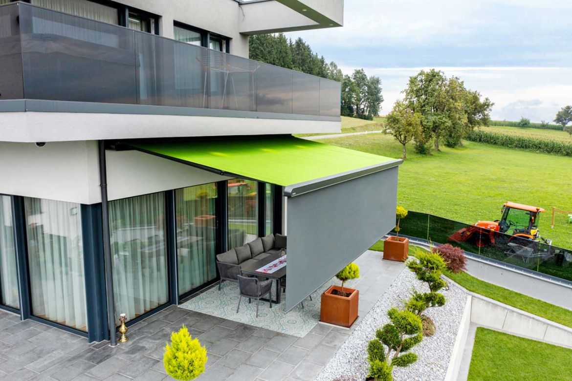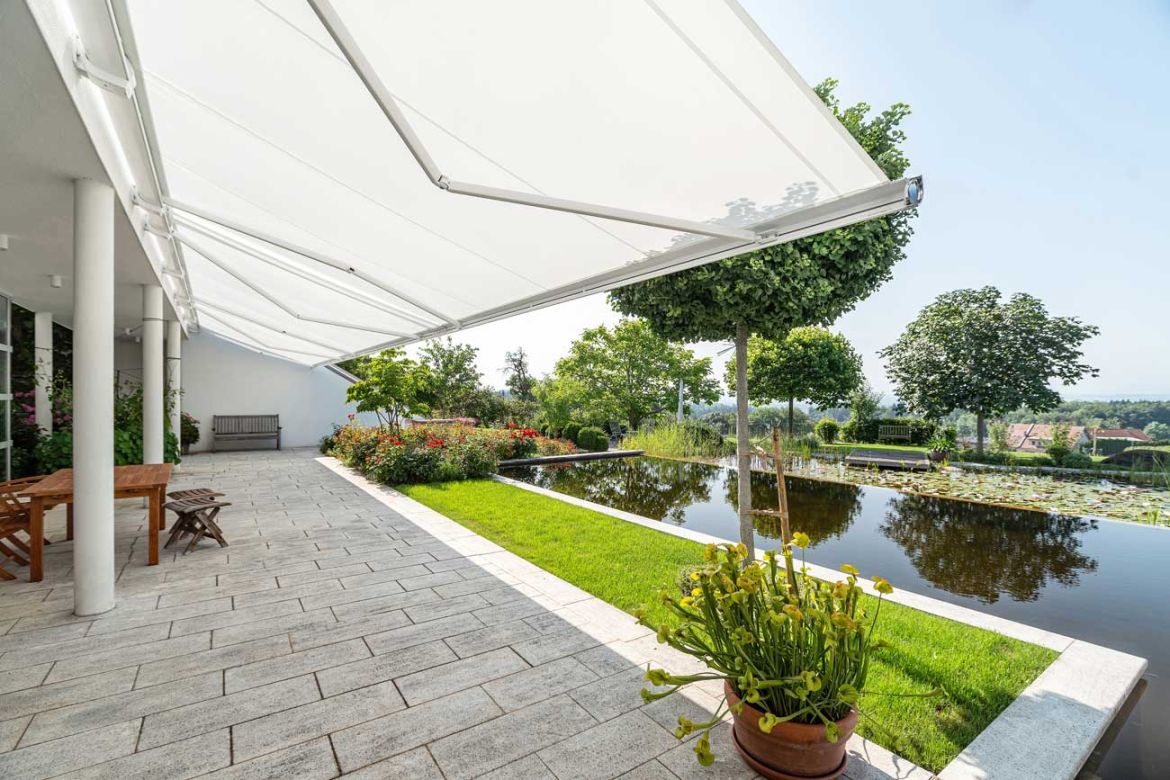 Markilux 970 – nowoczesna, pełnokasetowa markiza o płaskiej, kanciastej konstrukcji, idealna do nowoczesnych tarasów i balkonów. Kompaktowa kaseta (22,6 cm głębokości, 14 cm wysokości) chroni mechanizm i nadaje markizie elegancki wygląd. Dostępne warianty to 500 cm szerokości x 350 cm wysięgu lub 600 cm szerokości x 300 cm wysięgu.