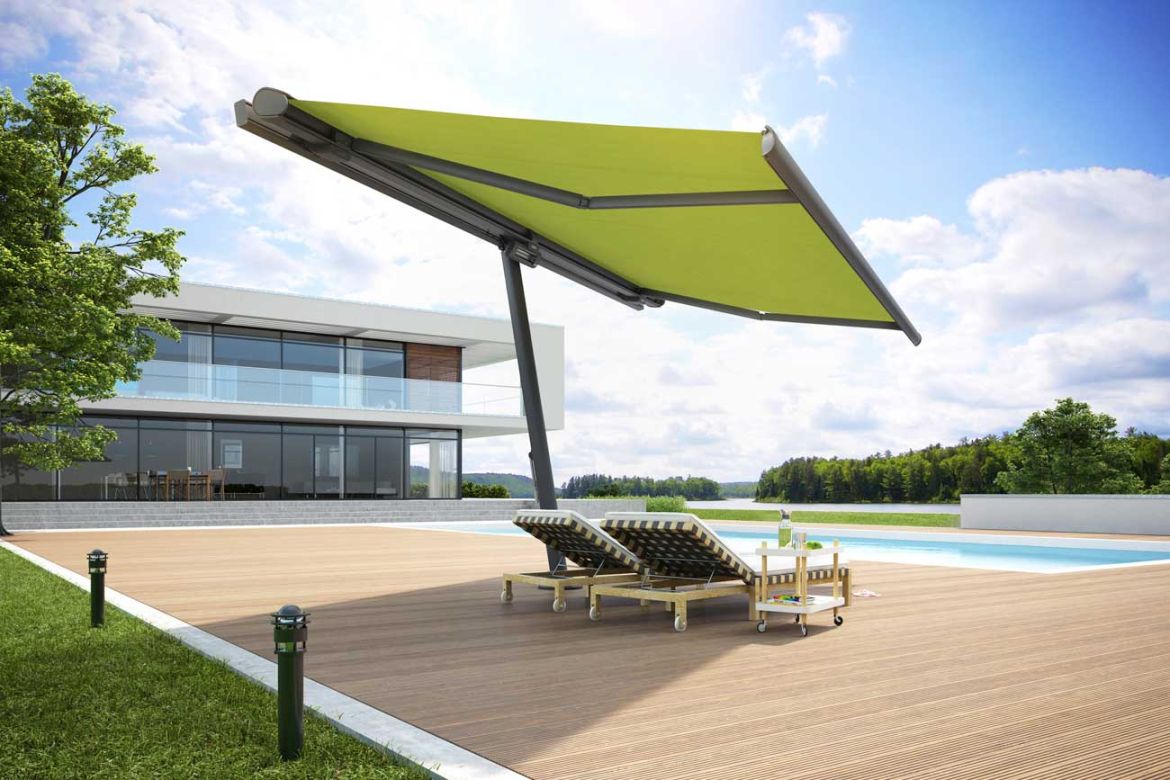 Maksymalna szerokość 710 cm i wysięg 400 cm gwarantują skuteczne zacienienie. Możliwość montażu ściennego, sufitowego lub krokwiowego z regulacją kąta 5°–50°. Standardowo sterowana ręcznie, opcjonalnie dostępny silnik przewodowy lub radiowy.