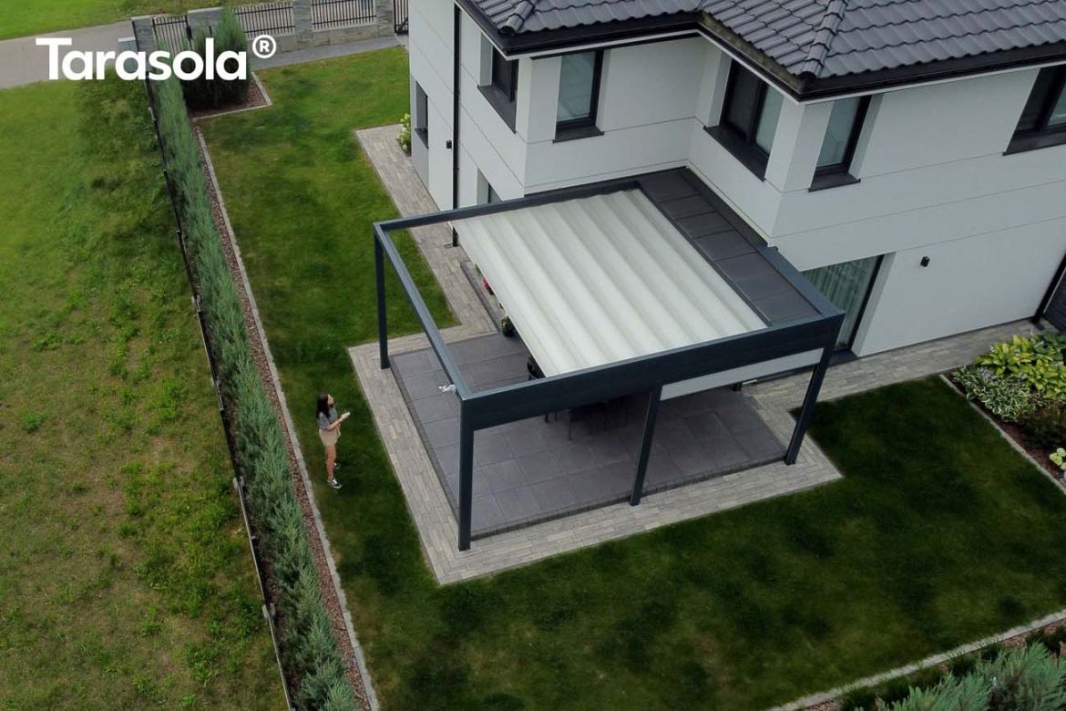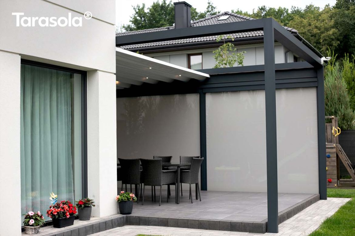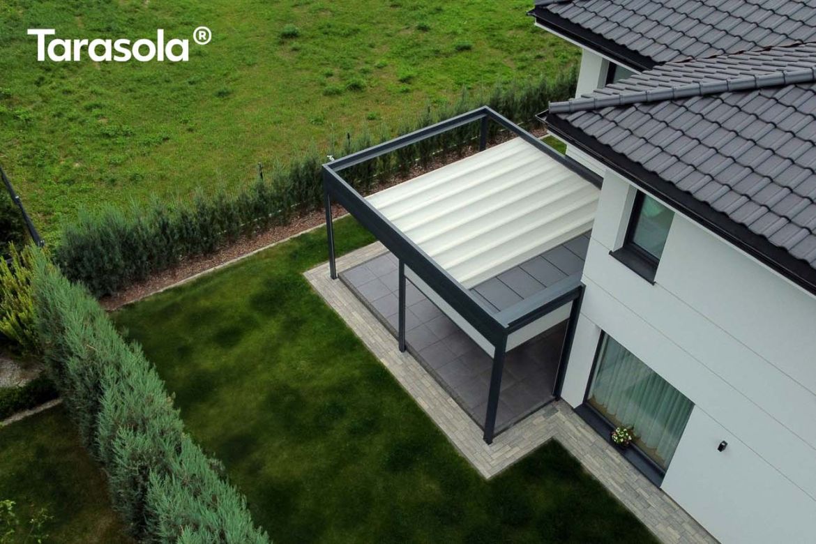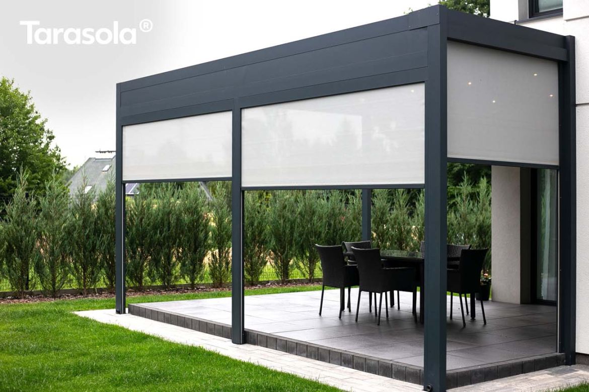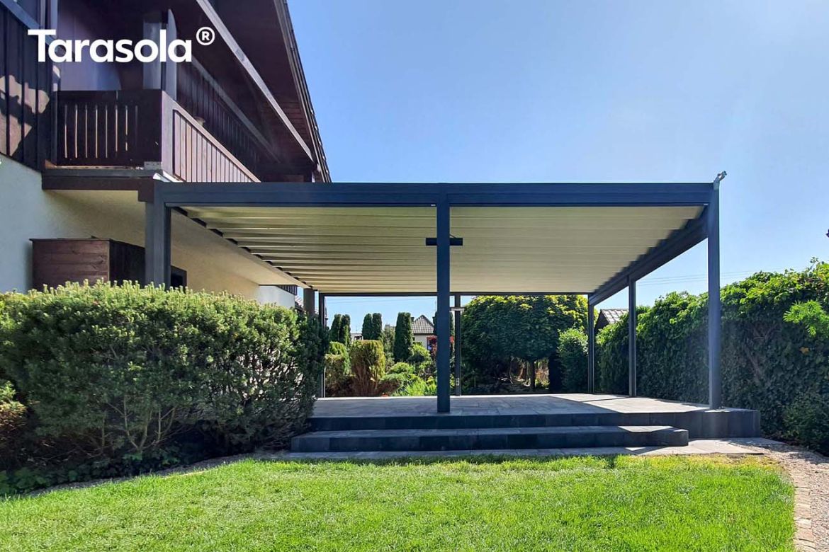 Tarasola Flat to stabilne i solidne zadaszenie, które doskonale sprawdzi się zarówno jako pergola montowana do ściany (przyścienna), jak i wolnostojąca konstrukcja w głębi ogrodu.