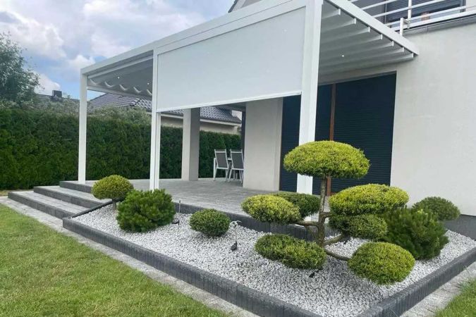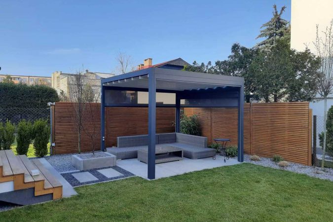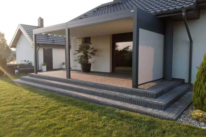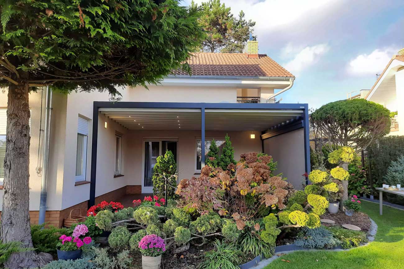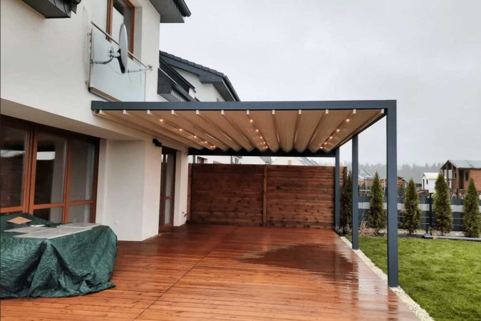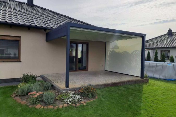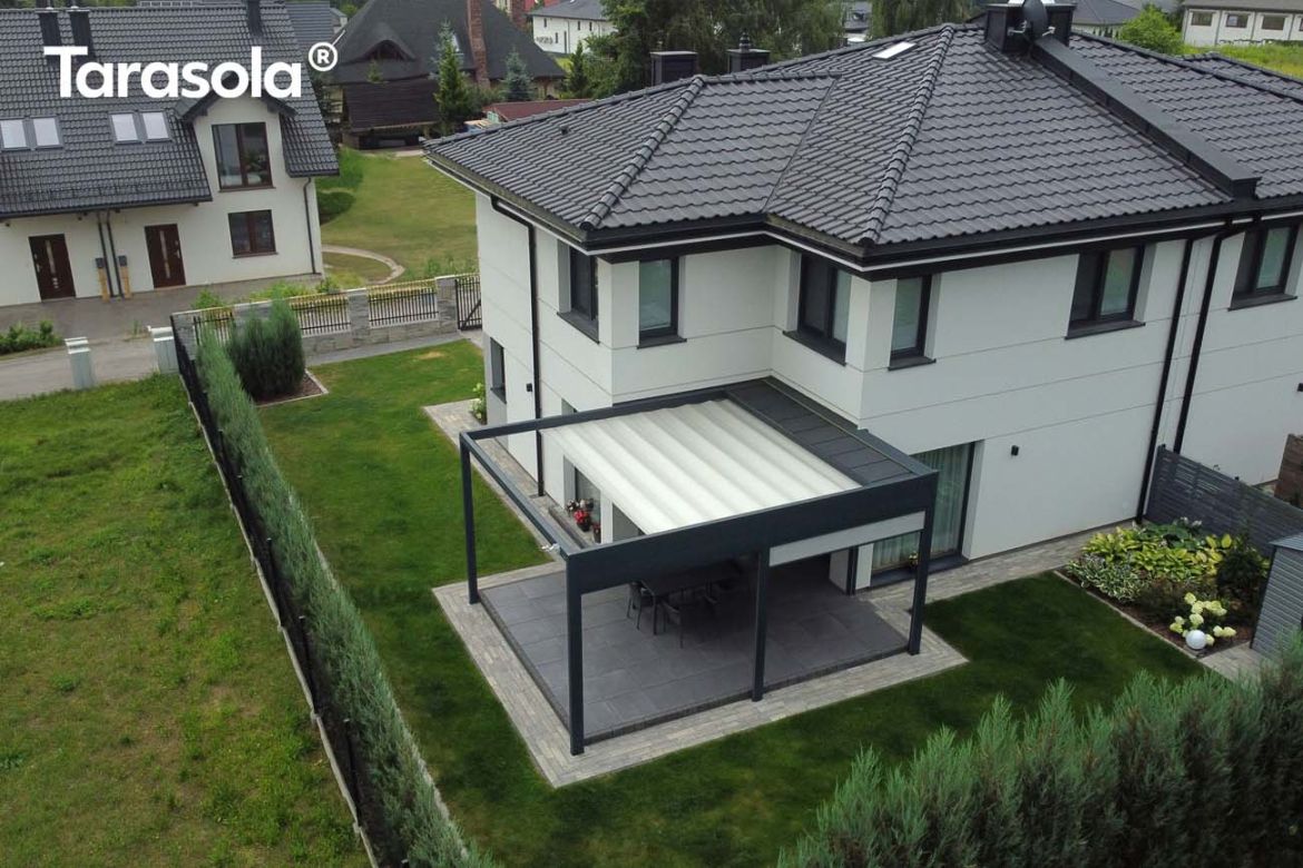 Tarasola Flat to stabilne i solidne zadaszenie, które doskonale sprawdzi się zarówno jako pergola montowana do ściany (przyścienna), jak i wolnostojąca konstrukcja w głębi ogrodu.