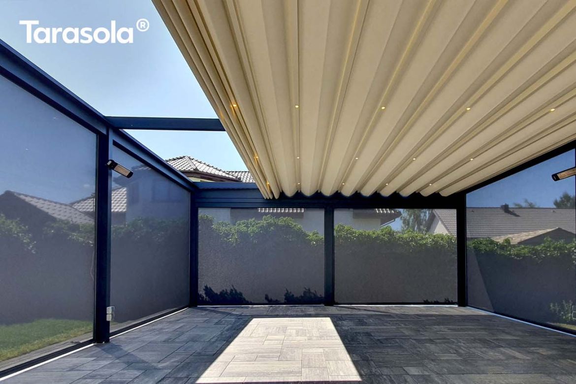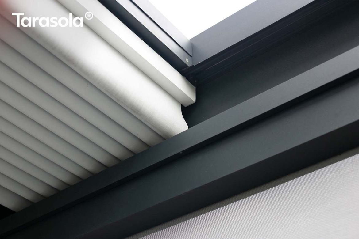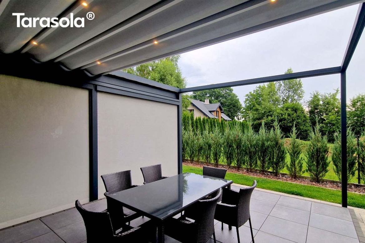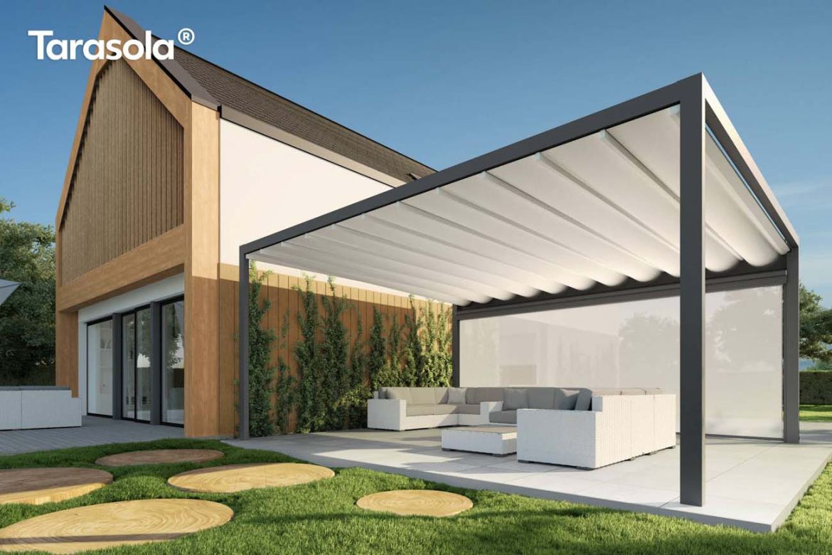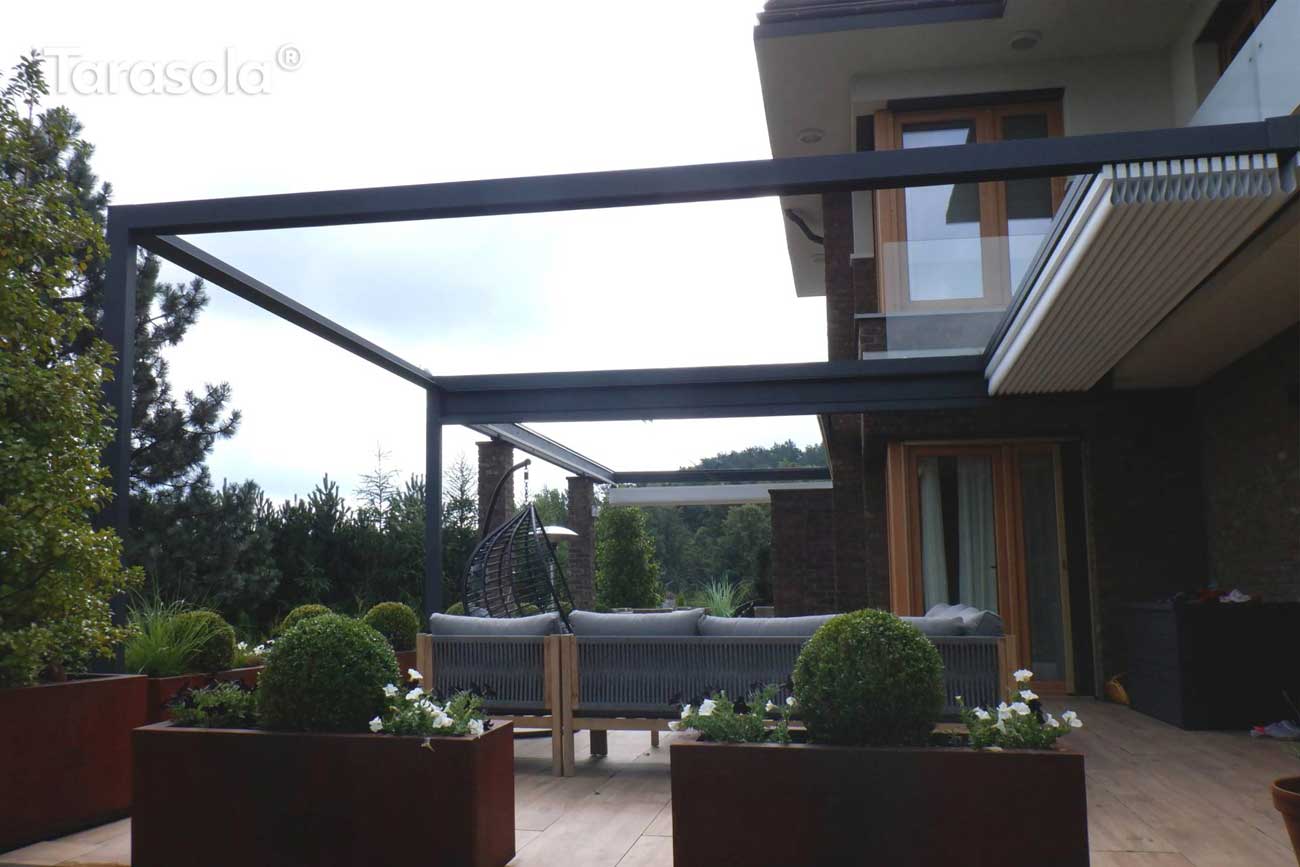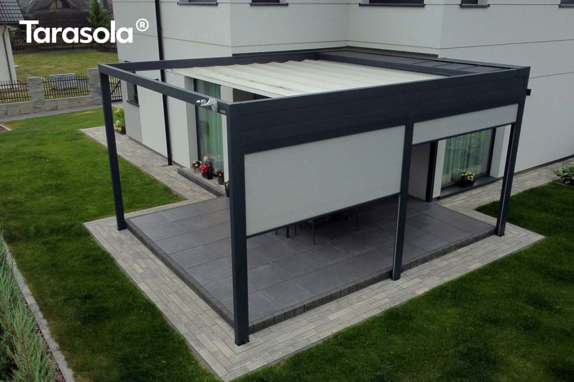 Rama pergoli składa się z aluminiowych, ekstrudowanych profili wraz z dachem materiałowym. Dach wykonany jest z trójwarstwowej tkaniny, która tworzy spadek na jedną stronę, z opcjonalnym odprowadzeniem wody opadowej. Zaletą pergoli Tarasola Flat jest możliwość rozbudowy o kolejne moduły, dzięki czemu powiększamy powierzchnię użytkową tarasu.