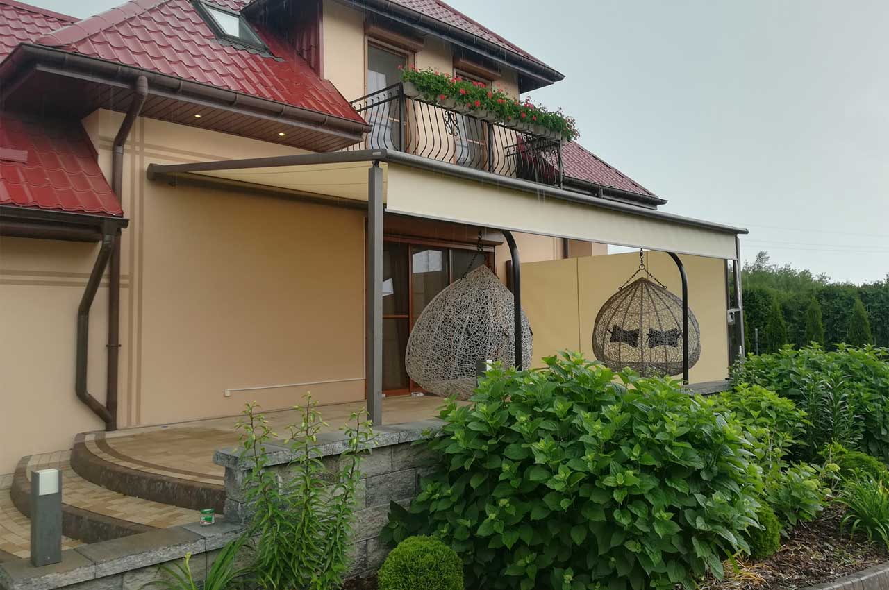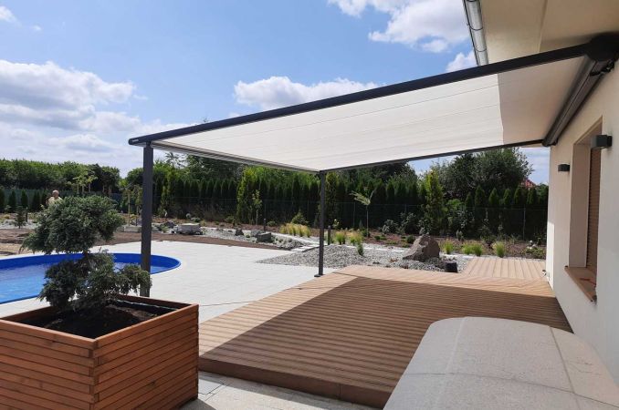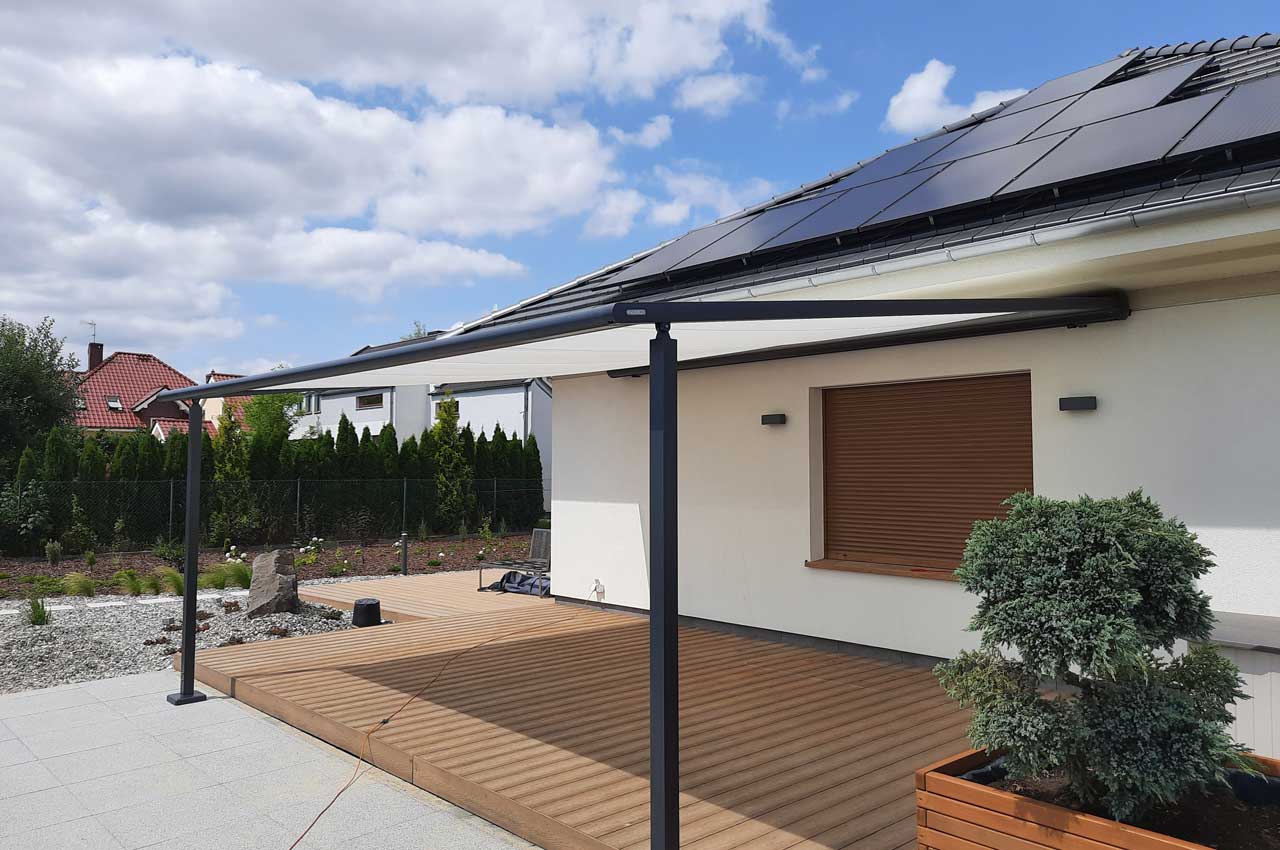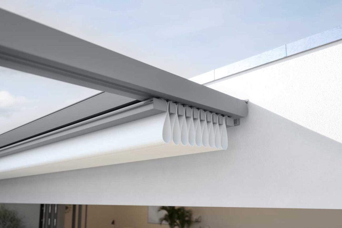 • opuszczana falbana z przodu pergoli (Schattenplus) - system montowany w wysuwającej się belce czołowej,