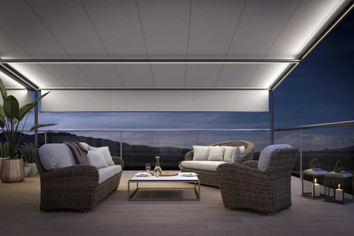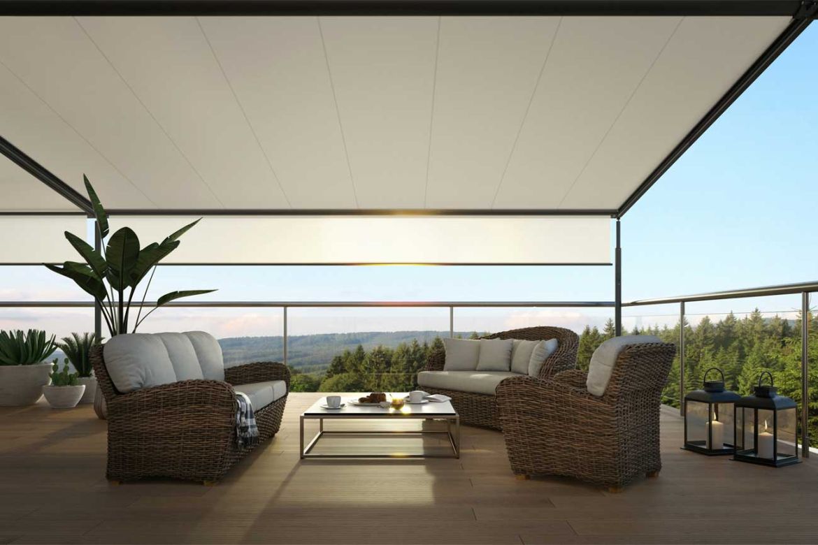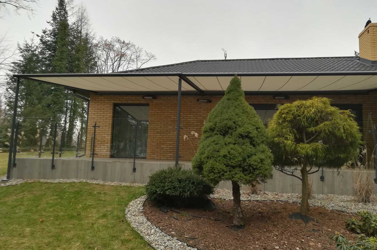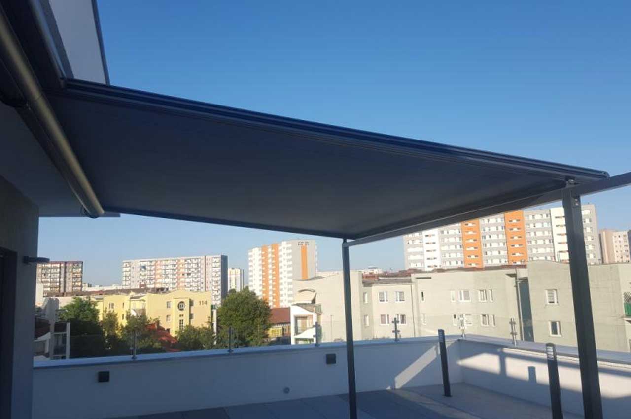 • opuszczana falbana z przodu pergoli (Schattenplus) - system montowany w wysuwającej się belce czołowej,