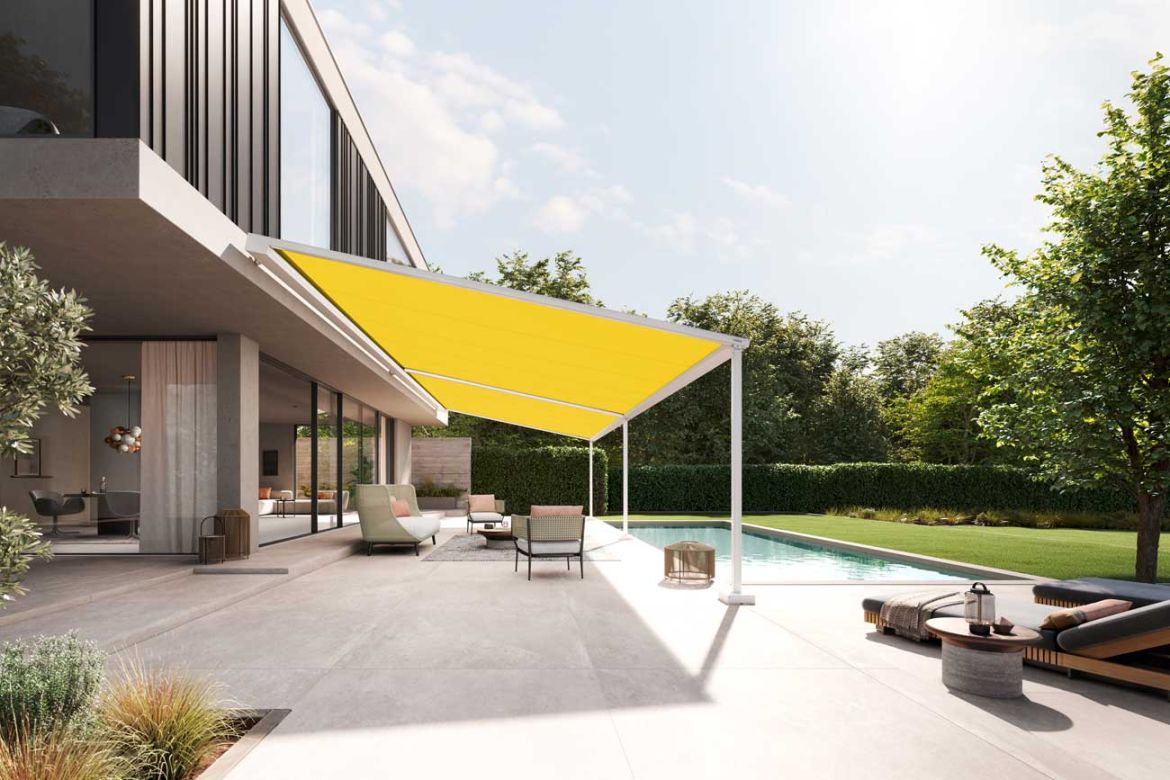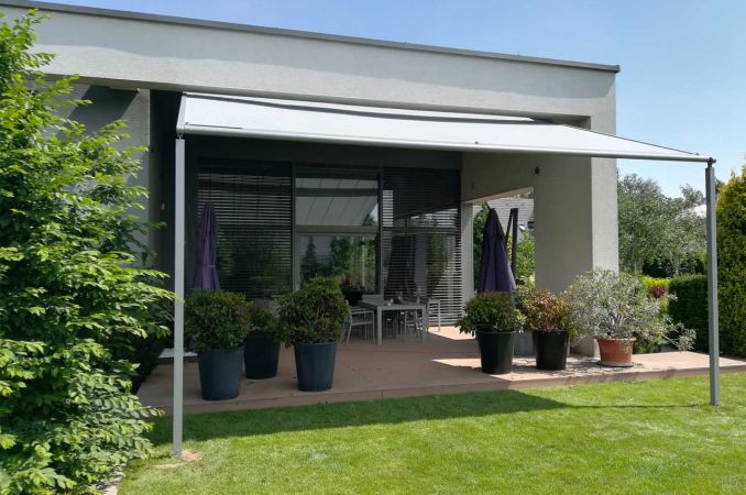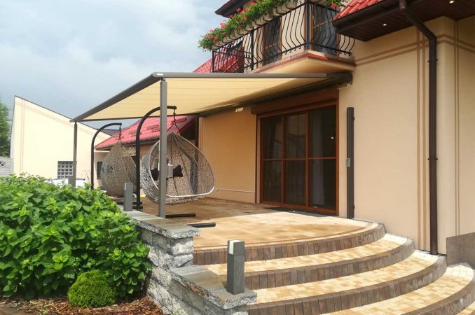Pergola Markilux 110/210 to nowoczesna i elegancka konstrukcja, wykonana na delikatnych, lecz wytrzymałych nogach o wymiarach 70 mm x 70 mm oraz szynach prowadzących. Standardowo wyposażona w system tracfix, który zapewnia stałe napięcie tkaniny, prowadzonej w specjalnej prowadnicy z zamkiem. Jedna z podpór frontowych ma regulowaną wysokość, co umożliwia efektywne odprowadzanie wody deszczowej na jeden z narożników. Pergola posiada 3 klasę odporności na wiatr, co gwarantuje stabilność nawet w trudnych warunkach pogodowych. Sterowanie odbywa się za pomocą pilota lub włącznika przewodowego.