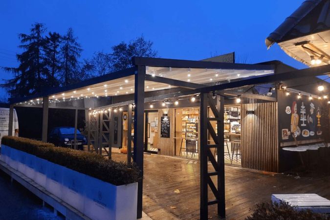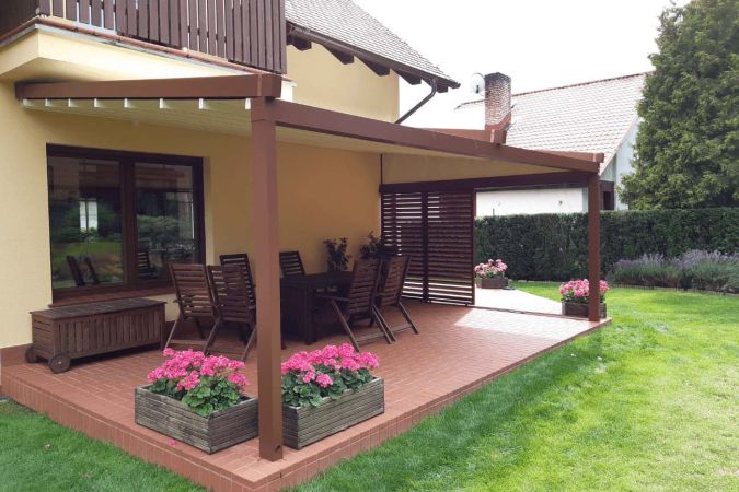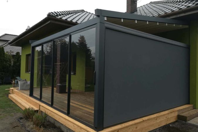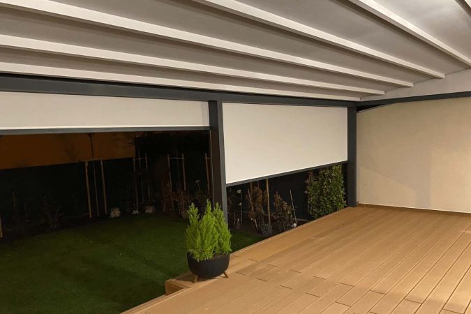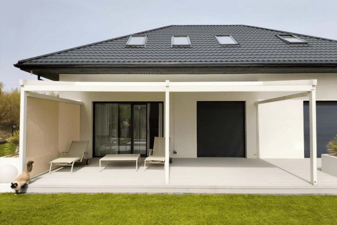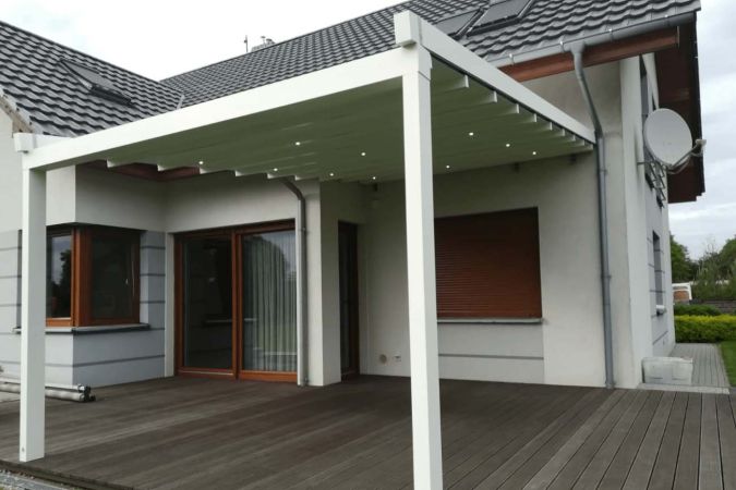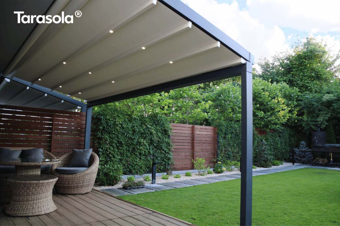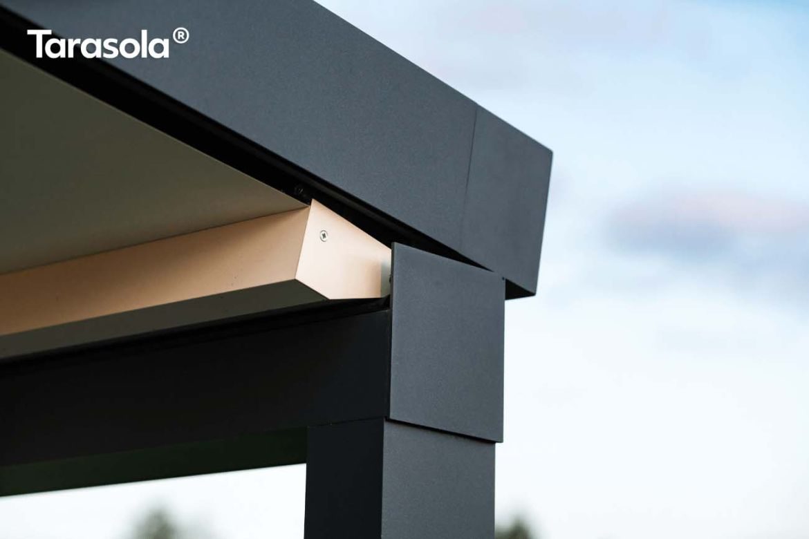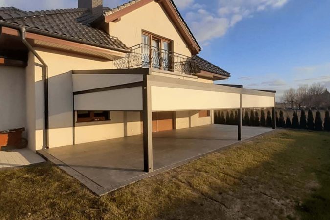 Klasyczna pergola aluminiowa z rozwijanym dachem materiałowym wykonanym z trójwarstwowej tkaniny Techprotect, która skutecznie chroni przed opadami deszczu oraz nadmiernym nasłonecznieniem. Konstrukcja składa się z jednospadowego dachu, daszka systemowego oraz ukrytej rynny w belce frontowej.