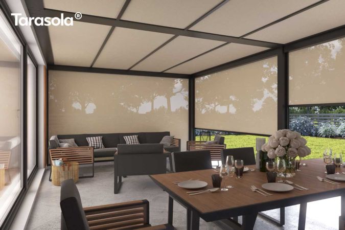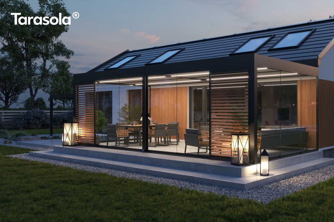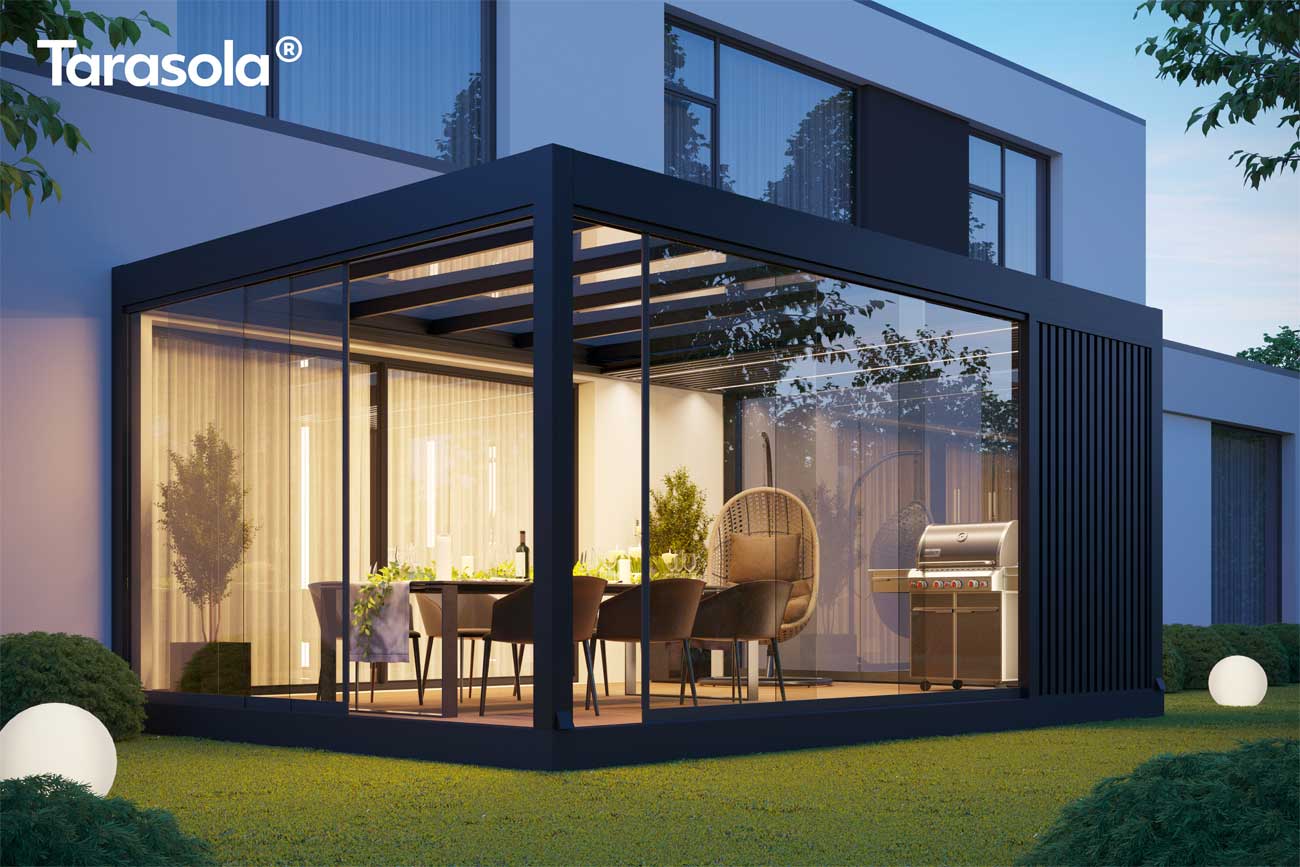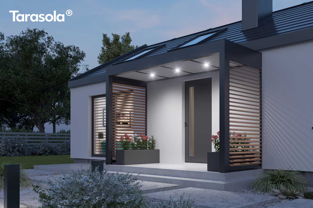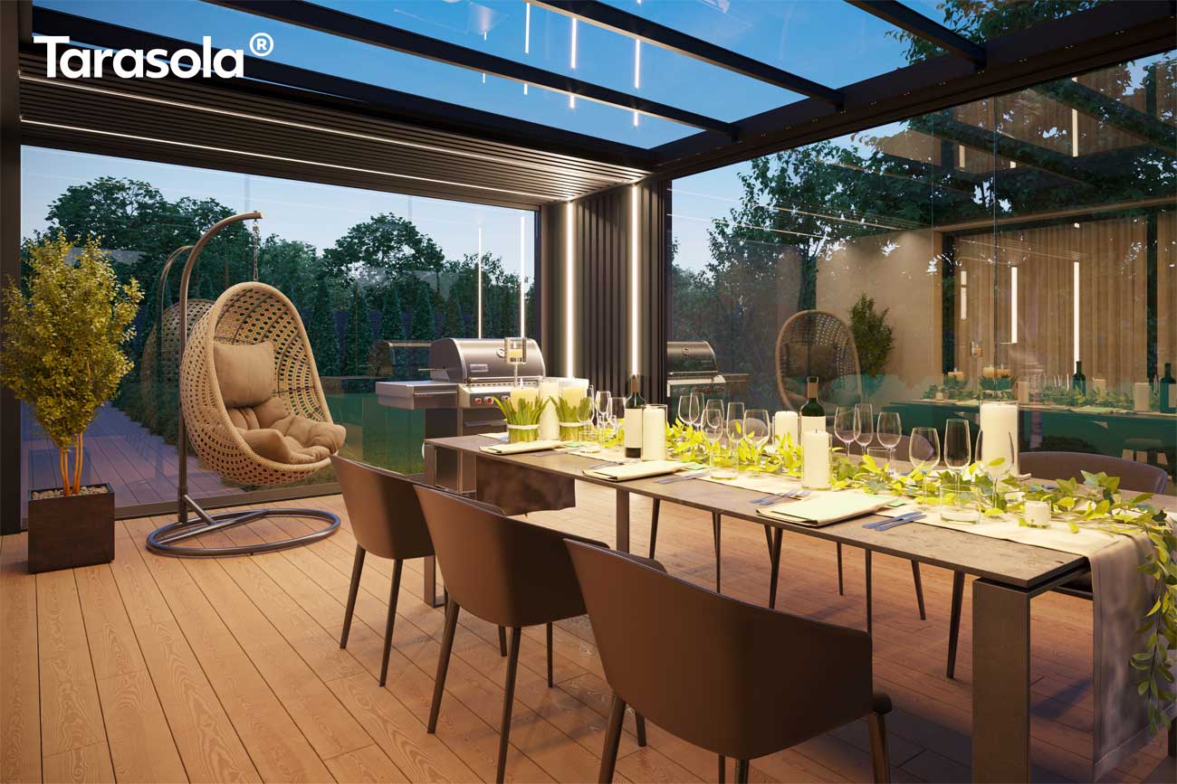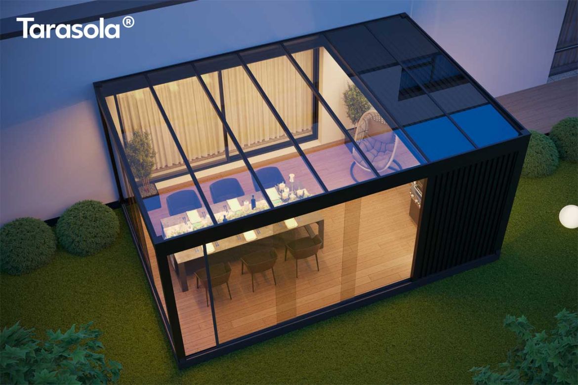 Tarasola FIX oferuje także opcję montażu paneli stałych, które mogą być wykorzystywane zarówno jako częściowa, jak i całkowita zabudowa ścian konstrukcji. Panele te doskonale chronią przed intensywnym światłem słonecznym, wiatrem i deszczem, a także zapewniają częściowe zacienienie – idealne rozwiązanie na gorące, słoneczne dni. Możliwość montażu paneli również na dachu pod poliwęglanem lub szkłem tworzy unikalny efekt wizualny, szczególnie w połączeniu z oświetleniem LED.