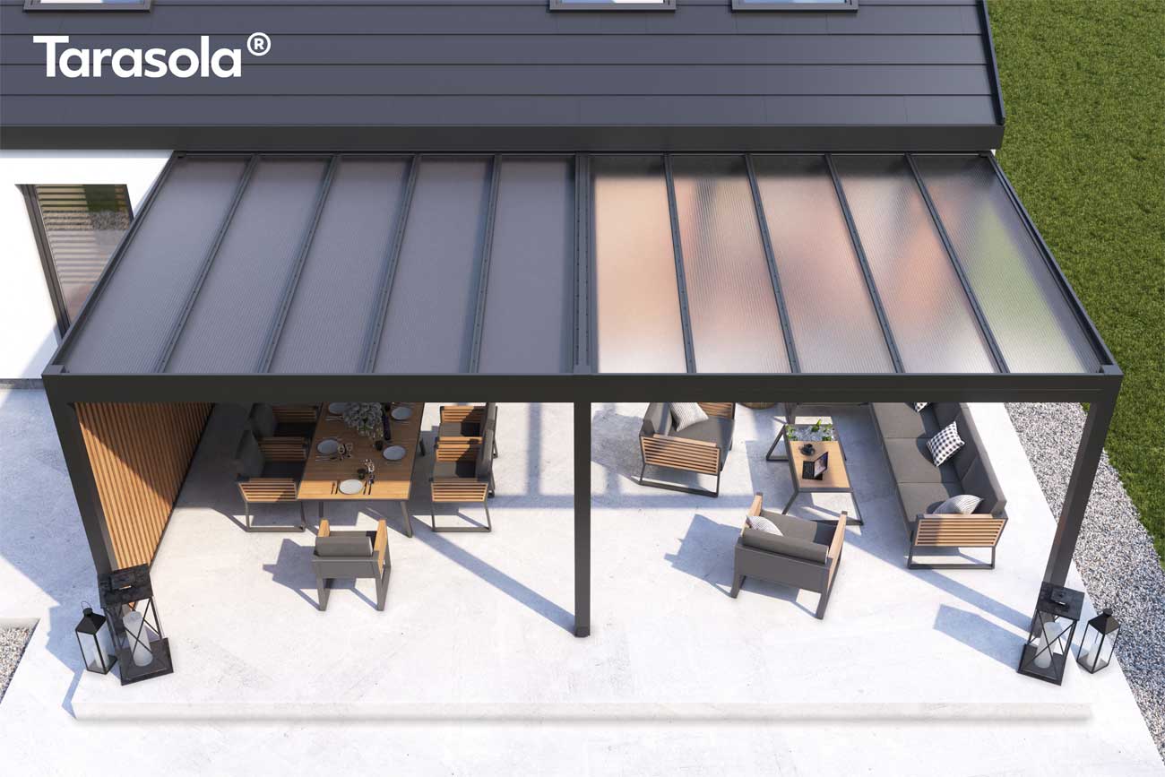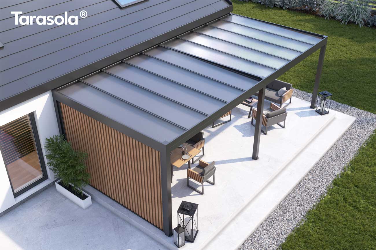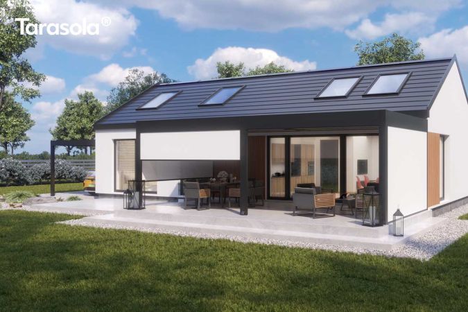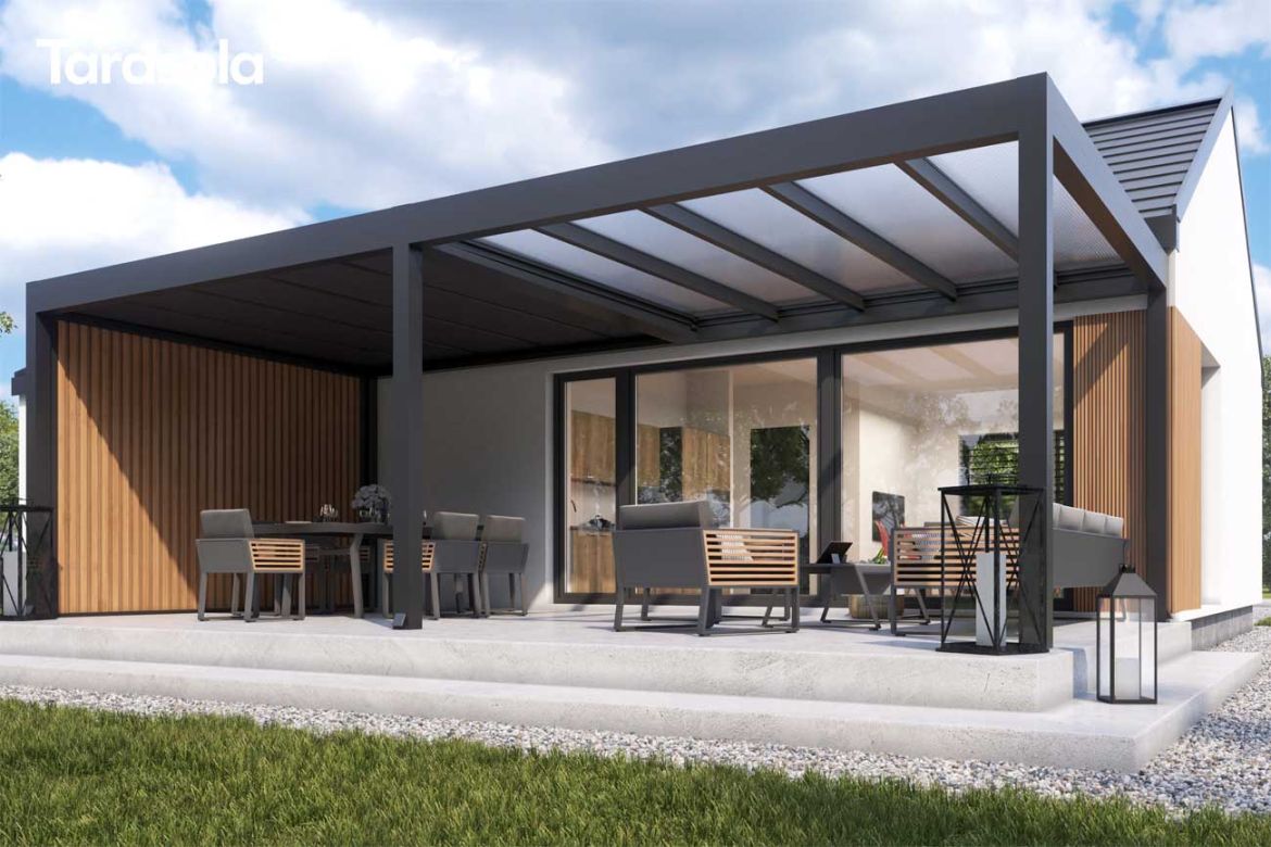 Tarasola FIX może być również wyposażona w dach z blachy trapezowej. To rozwiązanie jest szczególnie trwałe i zapewnia maksymalną ochronę przed deszczem, śniegiem i innymi trudnymi warunkami atmosferycznymi. Zadaszenie z blachy trapezowej jest doskonałe dla tych, którzy szukają wytrzymałego i solidnego rozwiązania.